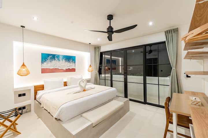 – Open-Plan Living: Spacious air-conditioned area with floor-to-ceiling glass doors, ocean-inspired decor, and surfboard accents 🛹.