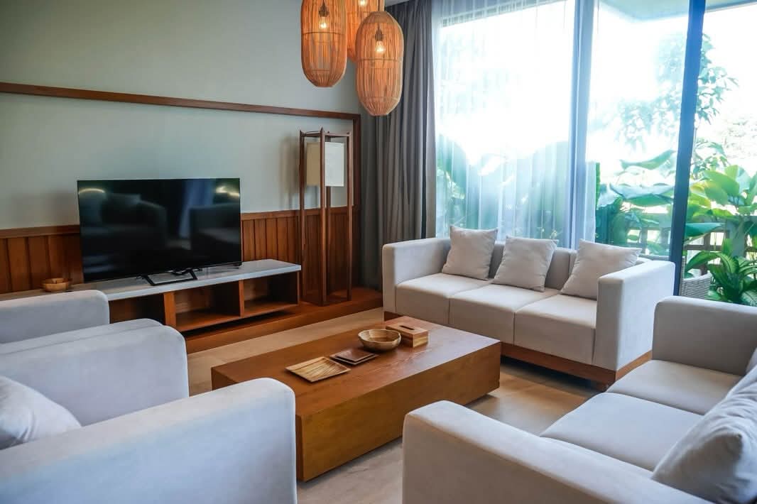 β’ What sets this living room apart is its seamless connection to the pool area β floor-to-ceiling glass doors slide open completely, blurring the line between indoor and outdoor living and allowing the refreshing Bali breeze to flow through