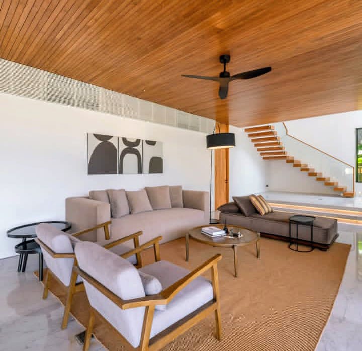 This fully equipped and staffed villa offers a seamless blend of indoor and outdoor living. The two-story layout features four beautifully decorated bedrooms and three modern bathrooms (two with bathtubs). Two distinct living rooms provide ample space for relaxation and entertainment: one connects seamlessly to the outdoor terrace, dining area, and fully equipped kitchen, while the upstairs lounge offers breathtaking panoramic views.