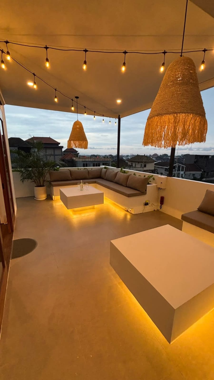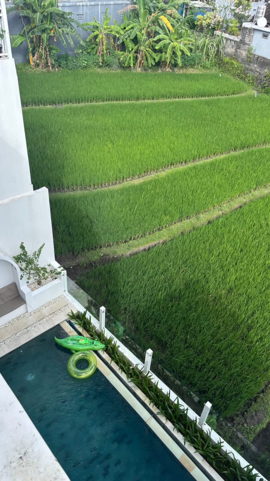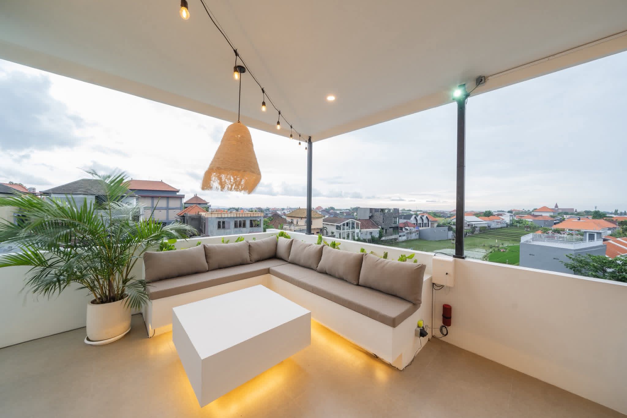 Di luar interiornya, vila ini sungguh memukau. Benamkan diri Anda di kolam renang infinity yang berkilauan, seolah menyatu dengan hamparan sawah hijau yang membentang di hadapan Anda – latar belakang yang indah untuk relaksasi dan momen tak terlupakan. Naiklah ke atap tertutup yang unik, yang disulap menjadi bioskop pribadi, menawarkan pengalaman hiburan eksklusif di bawah bintang-bintang.