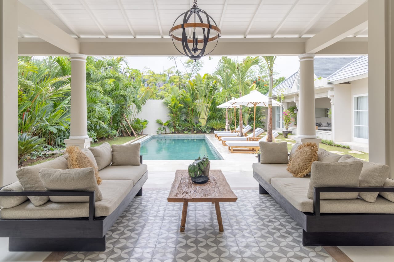 Picture waking up just moments from Berawa Beach, where balmy tropical winds intertwine with sleek Mediterranean-inspired architecture 🌴. This exceptional 4-bedroom villa delivers a unique fusion of elegance and coziness in one of Bali’s most coveted locales. Its open layout flows into a dense tropical garden and tranquil swimming pool 🏊♂️ lined with sun loungers, ideal for slow mornings and unwinding. The primary living space seamlessly merges indoor and outdoor areas, bathed in natural light, soft hues, and bespoke details—from artisanal spa-like bathroom tiles 🛁 to a refreshing terrace lounge 🪑. Every element radiates effortless sophistication.